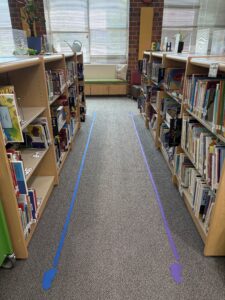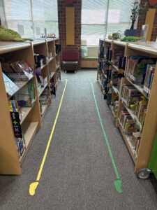 - *Use one color per shelf side (e.g., blue footprints for 600s, purple for 700s, etc.)