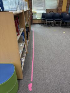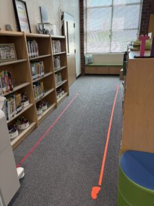To make the Non-Fiction section more user-friendly, I purchased colored Velcro tape and matching colored footprint decals. My goal was to create color-coded pathways on each side of my Non-Fiction shelves to visually guide students toward the books they’re looking for.